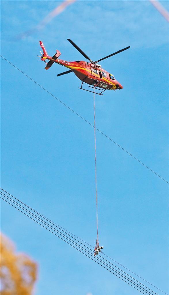 2月9日,江苏省淮安市盱眙县淮河镇,技术人员采用直升机对500千伏宿安线实施地线带电消缺作业。相较传统人工带电作业方式,直升机带电作业大幅提升了作业安全系数和效率。梁德兵摄(中经视觉)