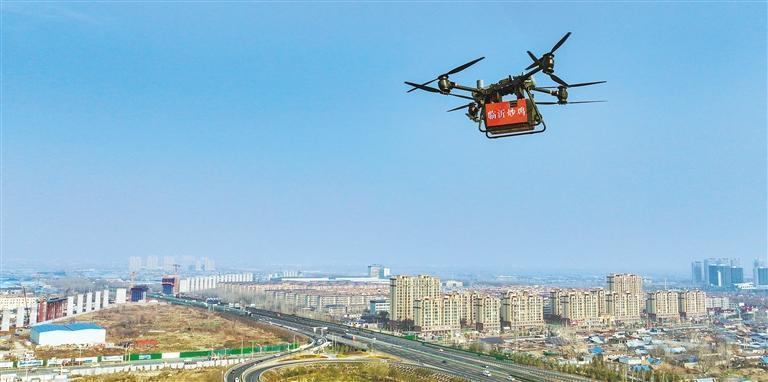 2025年11月24日,山东省临沂商城,无人机正在进行餐饮配送。尹召功摄(中经视觉)