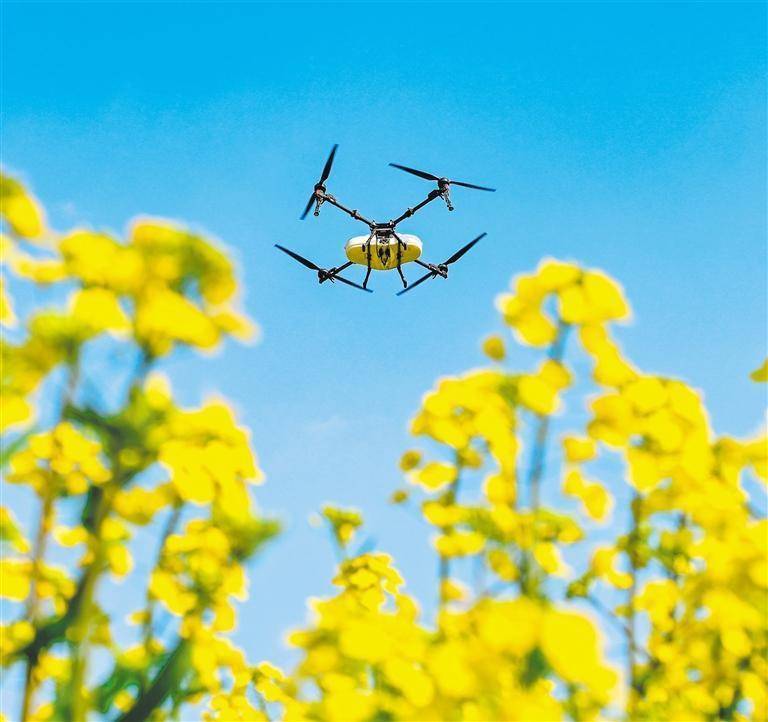 3月12日,湖北省黄冈市浠水县汪岗镇陈庙河流域高标准农田,种粮大户使用植保无人机为油菜田施肥。王 江摄(中经视觉)