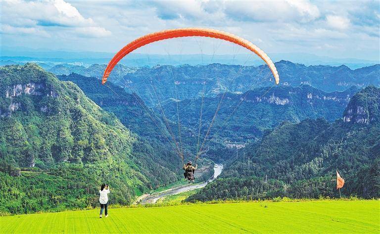 2025年9月27日,湖南省吉首市矮寨风景名胜区滑翔营地,游客乘坐滑翔伞在空中游览矮寨大桥和苗岭大峡谷美景。梁永鸿摄(中经视觉)