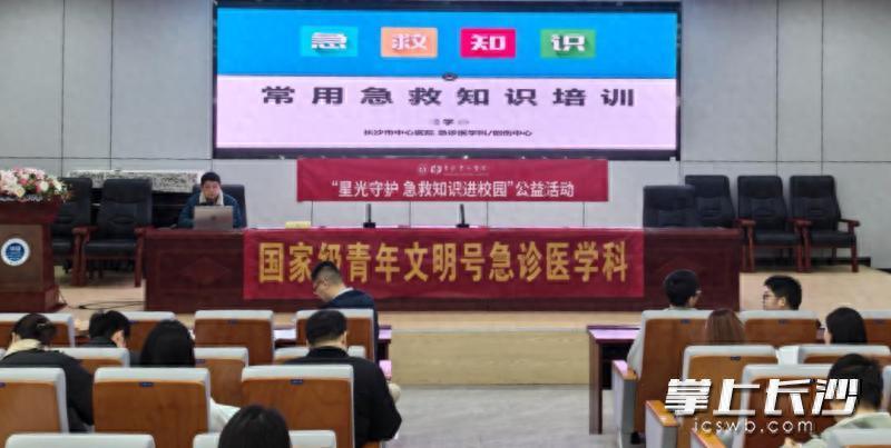 活动现场,长沙市中心医院急诊医学科副主任医师张学峥结合临床案例,用通俗易懂的语言开展“常用急救知识培训”专题授课,并围绕校园及日常工作中可能遇到的突发情况,进行分析、讲解,通过互动问答的方式,让大家在轻松氛围中牢记急救核心知识。