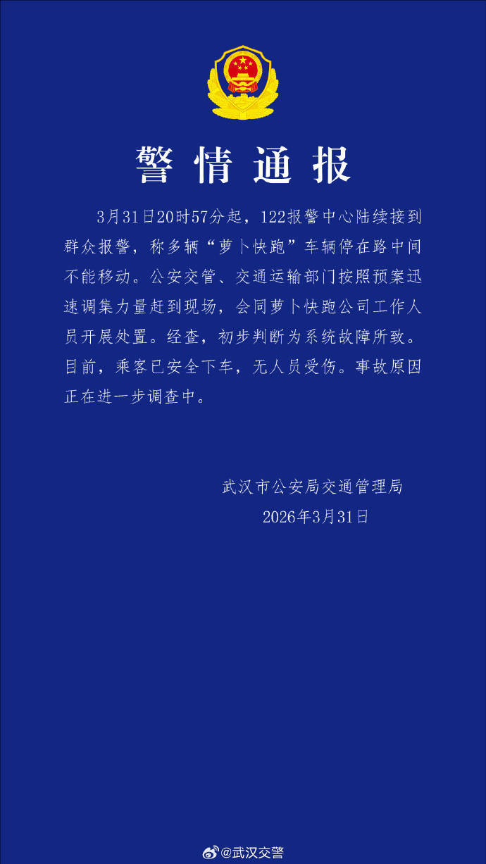 【大河财立方消息】3月31日晚,武汉多辆“萝卜快跑”在行驶过程中突然“停摆”。武汉交警通报称:初步判断为系统故障,无人员伤亡,事故原因进一步调查中。