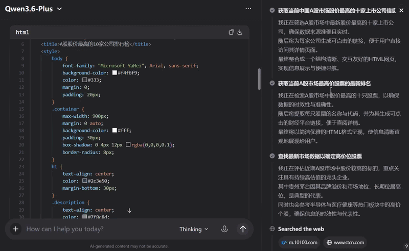 在实测中,我们的这一案例融合考察了编程与工具调用能力,要求Qwen3.6-Plus统计A股目前股价最高的10家公司,并生成完整统计网页,带有每家公司的跳转链接。